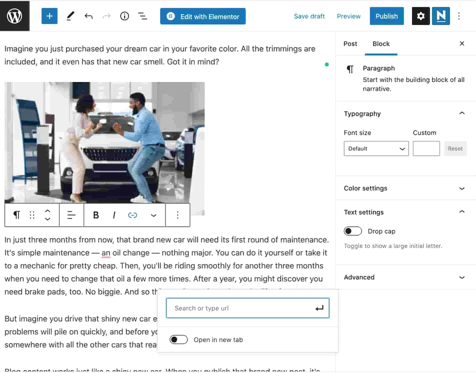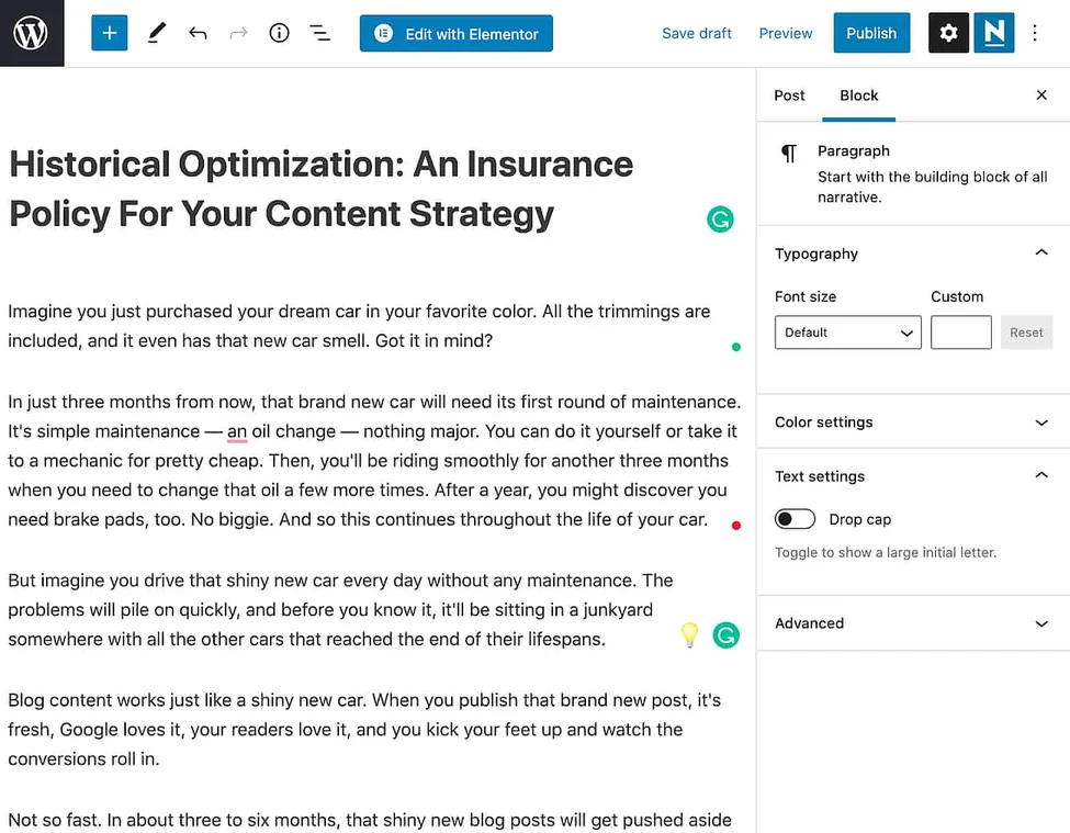 You’ve arrived where you’ll add your masterpiece (AKA your content) for Creating a Blog on WordPress. But before starting this process, we have a few pointers. First, be sure to save your work frequently or write it in a separate Google or Word document and copy it over to the content management systems (CMS). This is a wise idea because, while WordPress does save your progress automatically, it might not pick up on changes made if you lose your internet connection. Not to mention, drafting your content in a separate document is a good idea so you don’t get overwhelmed by simultaneously formatting, editing, and writing. Click the “Save draft” button in the upper right-hand corner to save.”