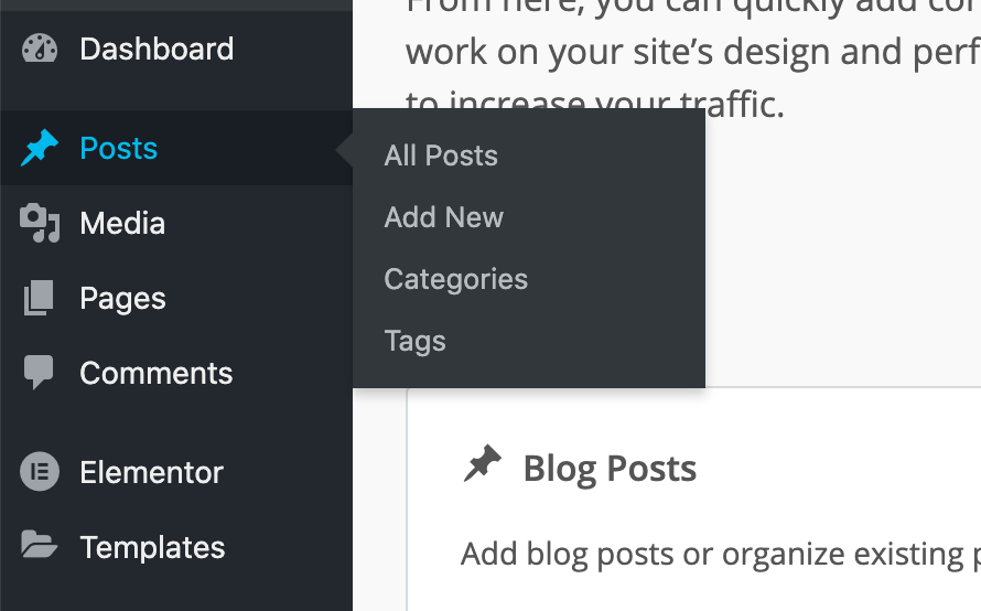 The first thing you need to do to get your WordPress blog off the ground is create a post. We’ve created an example you can follow to help you Creating a Blog on WordPress. First, log in to your WordPress administrator area and select “Posts” from the menu options on the left. Then, select “All Posts” in the dialogue box that appears.