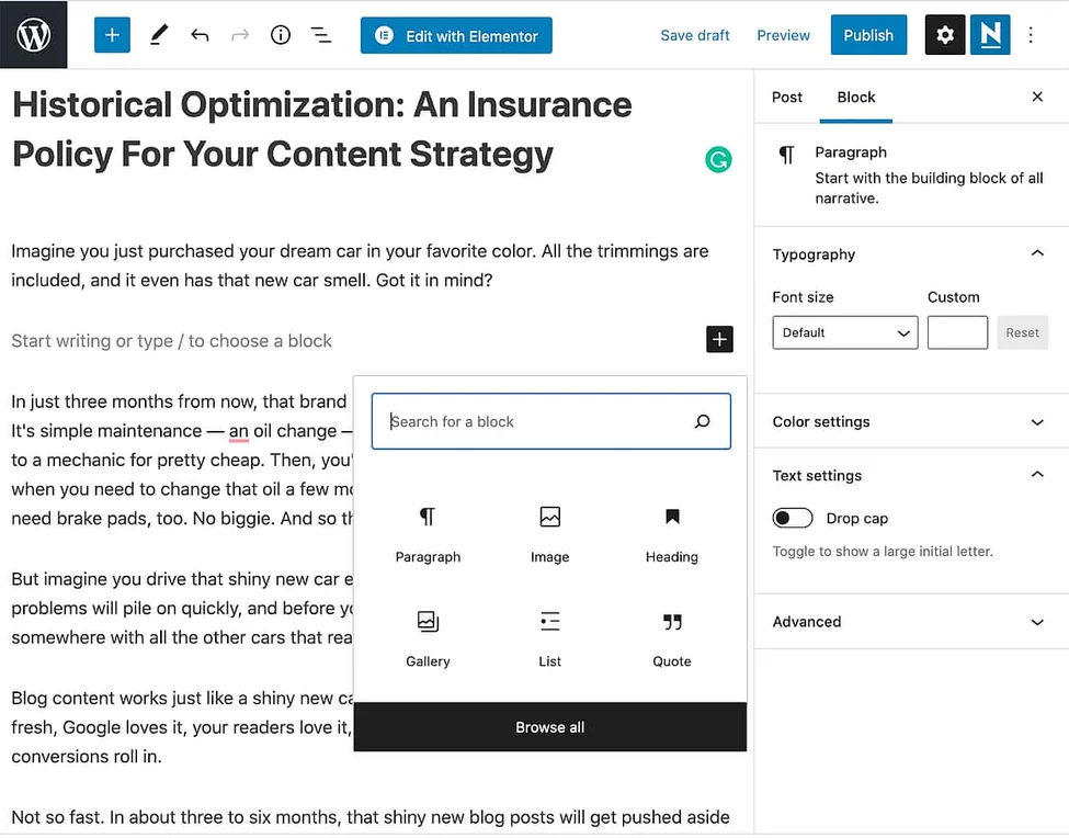 WordPress uses a block editor, which works exactly as you’d imagine — by creating blocks for each section of content you add. For example, paragraphs will be separated into blocks, as will images and headings.